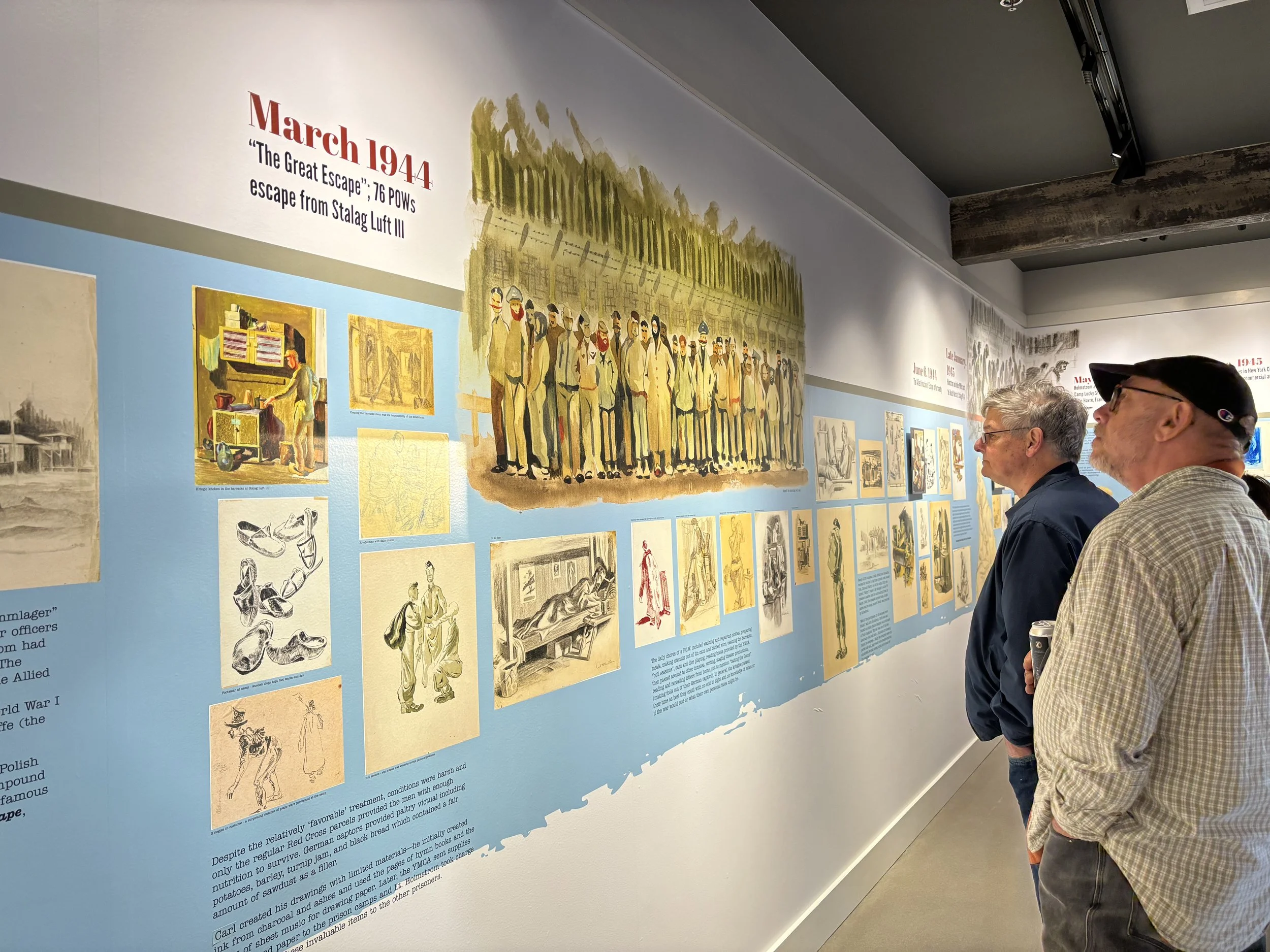 Holmstrom chose to carry the visual record he’d made of his 28 months in captivity, and Ball & Socket Arts in Cheshire celebrates that decision, and honors Veterans Day, with the exhibition, “Stalag Survivor: The Art of Carl H. Holmstrom,” on view from Oct. 18 to Nov. 24, 2024. Included with the exhibition at Ball & Socket’s Workshop Gallery (493 W. Main St., Bldg. 3) will be the sketches, finished drawings and watercolors from Holmstrom’s time in captivity, mostly at Stalag Luft III, the site of the legendary Great Escape.