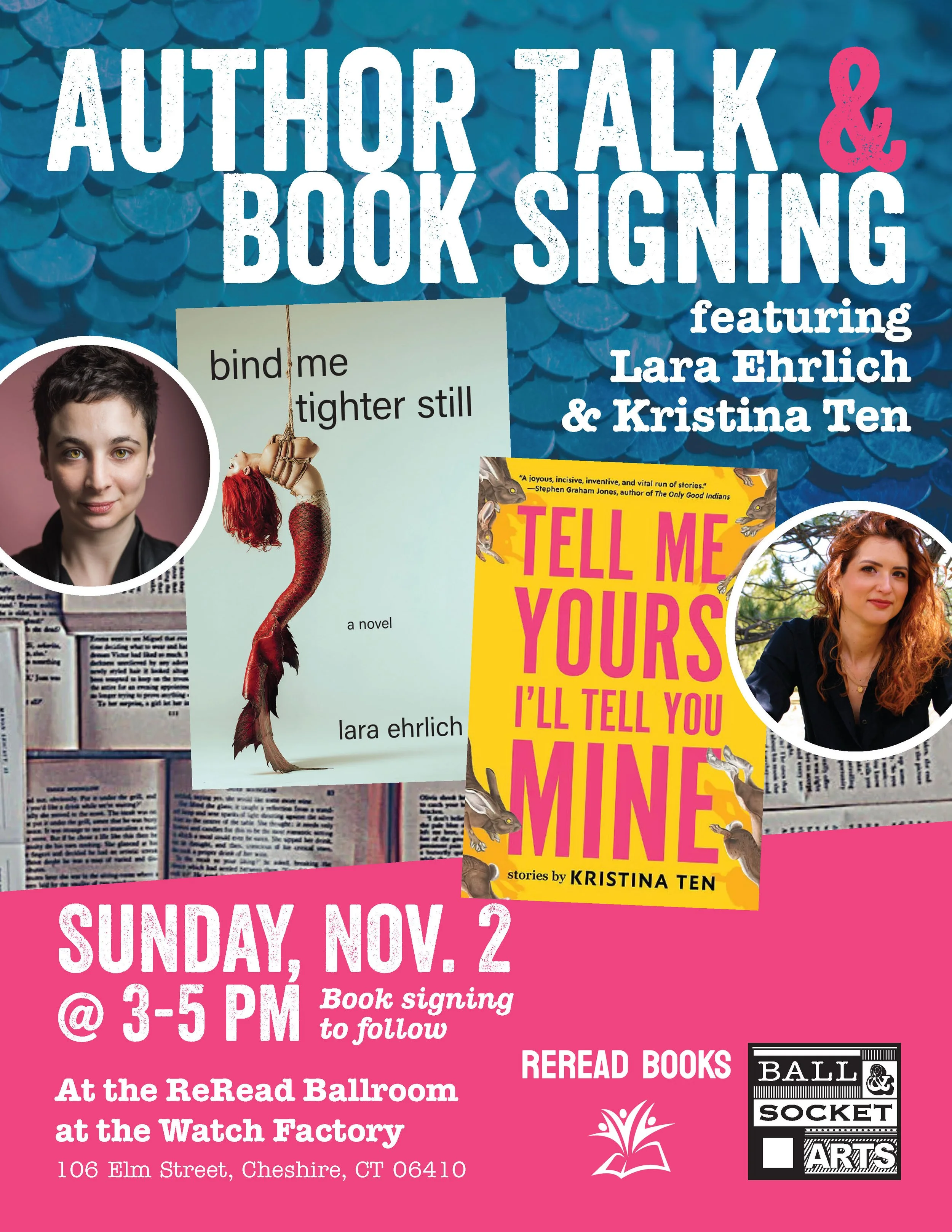 On November 2nd from 3-5 pm, in partnership with ReReads, we will host an Author Talk and Book Signing featuring Lara Ehrlich and Kristina Ten in conversation about their recent works of fiction: Bind Me Tighter Still and Tell Me Yours, I’ll Tell You Mine.