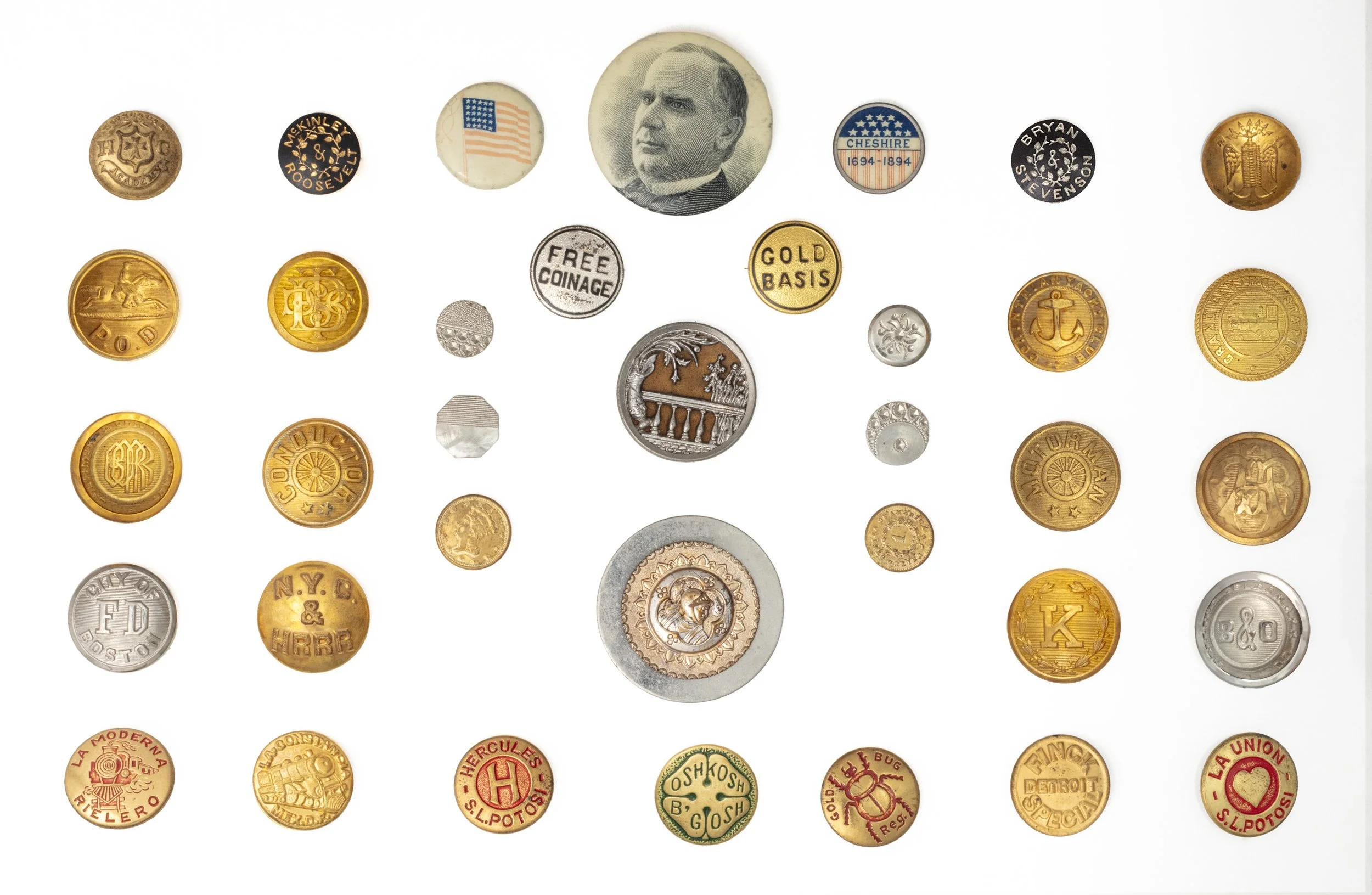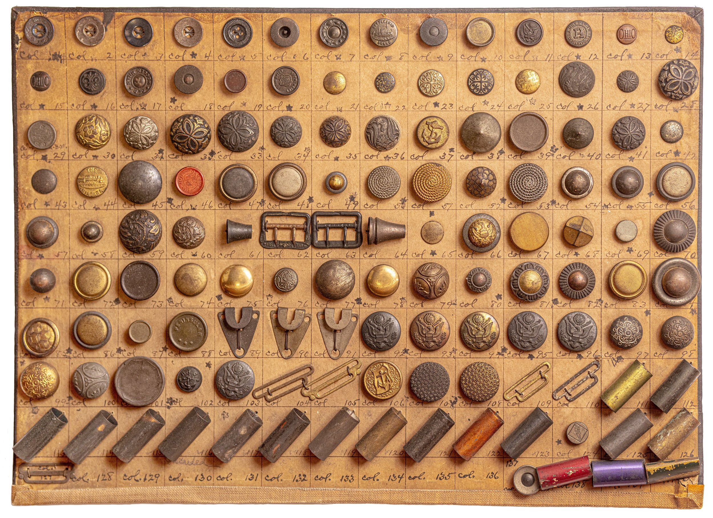We may not think much about them today, but in the mid-19th century buttons were a growth market. The expanding global trade in fabrics and mass manufacture of the home sewing machine were bringing radical change to daily wear in the United States. Until then, most women had two or three dresses. Now they could have several, and older garments could be more easily updated to the latest fashion. Buttons became important trend statements, often replacing complicated hook and eye catches, ribbons, ties and temporary stitching. Though metal buttons were Ball & Socket's staple product in later years, the company made its name with fancy glass buttons known as "Cheshire Jewels," which are considered highly collectible today. Uniform buttons made by the company were worn by armed and civilian forces including U.S. forces in the Civil War, and the Free French and Soviet Armies in W.W. II. The company also made an array of other stamped metal products including jingle bells, cardholders, drawer pulls and razor parts. A "ball & socket", by the way, is what today we call a "snap" fastener—the two part thing where the ball snaps into the socket!