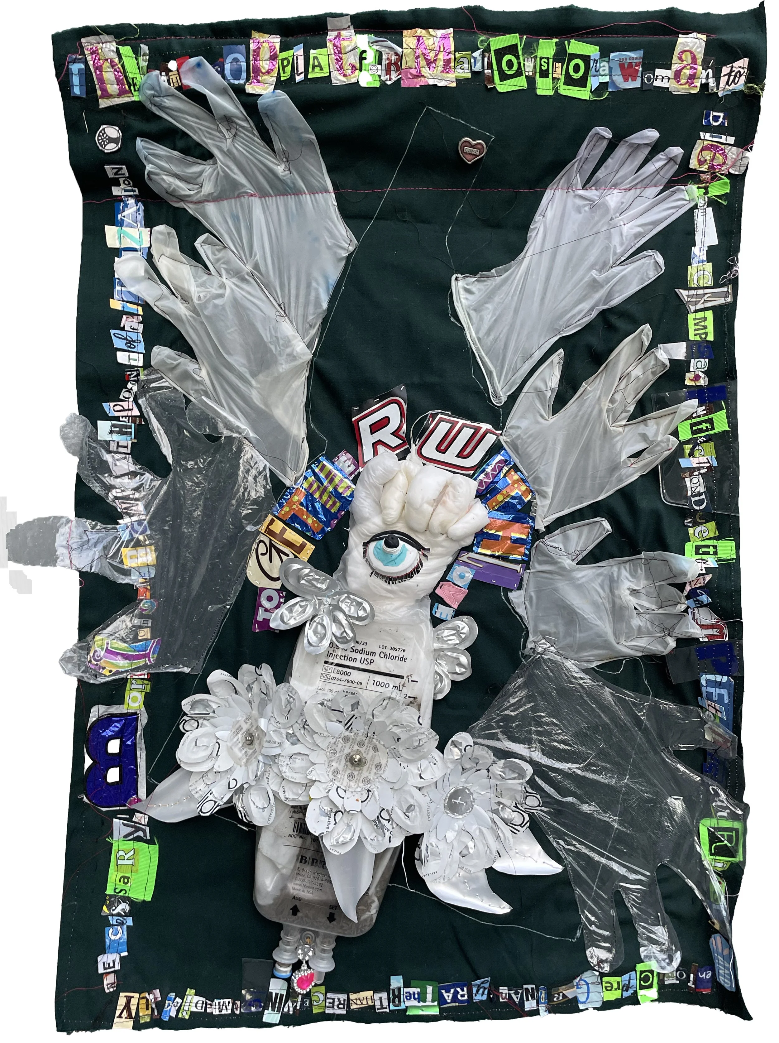 Sarah reimagines the flag—an emblem of national pride and unity—using discarded medical materials such as pill packs, gauze, surgical socks, and syringe tubes. These flags represent waste in America's healthcare system, both figuratively and literally. They explore the equality of those who have access to healthcare. Minorities, women, and people of lower socioeconomic status receive different care than wealthy white men. Alongside the flags, abortion access maps, constructed from similar debris, show in which states reproductive rights are banned or are safe and legal. These maps lay bare the consequences of political decisions on real bodies.