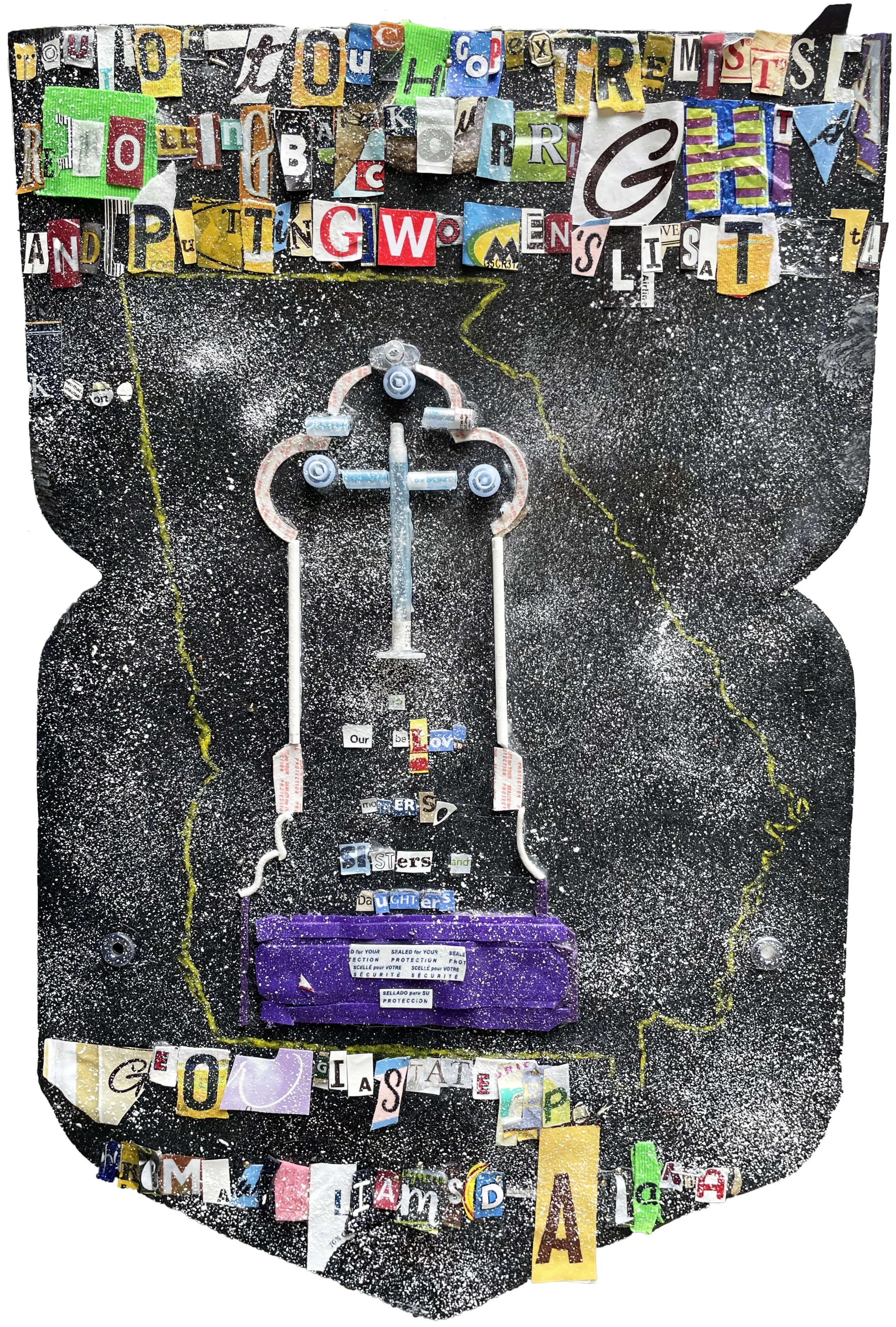 In "Red, White, and Bruised," artist Sarah Schneiderman confronts the fractured healthcare and reproductive landscape in the United States. Schneiderman made these poignant assemblages from non-recyclable medical and other debris. This exhibit juxtaposes imagery of American flags with maps showing state-level abortion access. Each piece in this exhibit examines the promises of liberty and justice against the realities of unequal care, legislative control, and choice.